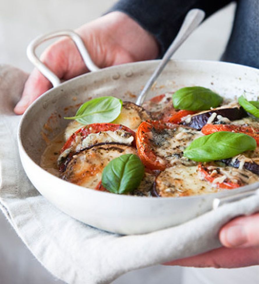 3. Lado kasvis- ja juustoviipaleet vuorotellen öljyttyyn uunivuokaan, puoliksi limittäin.