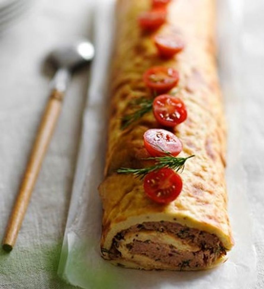 Valuta tonnikalat kuiviksi. Pilko paprika, kuori ja silppua sipuli. Kuullota paprika ja sipuli pehmeiksi pannulla öljytilkassa. Sekoita kaikki täyteaineet yhteen. Levitä täyte munakaslevylle ja kiedo levy napakalle rullalle. Jätä saumapuoli alaspäin.