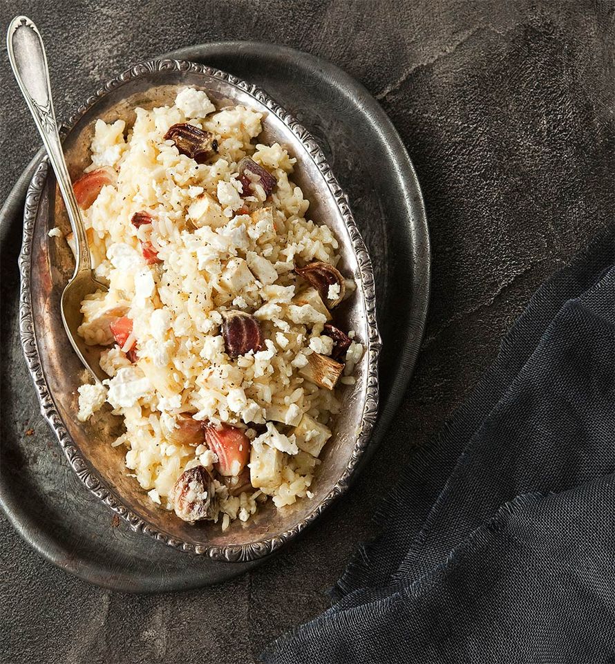 Jos jatkuva hämmentäminen ei ole sinun juttusi, kokeile uunirisottoa. Se valmistuu melkein itsekseen, ja samalla lämmöllä kypsyvät myös juurekset kyytipojaksi.