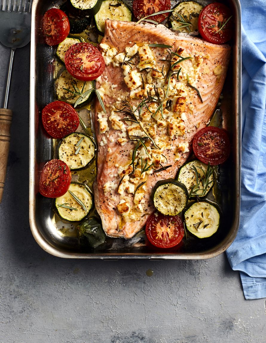 Voit pilkkoa kreikkalaisen uunilohen kanssa samalle pellille myös ohuita perunasiivuja ja nakata mukaan muutaman oliivin. Kesäkurpitsat saavat jäädä napakoiksi ja kala meheväksi.