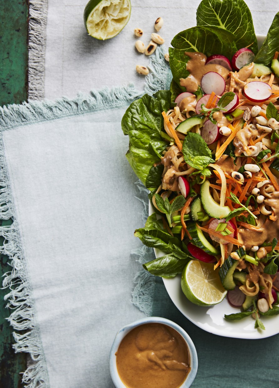 Kurkku, porkkana, minttu ja limetti pitävät vegaanisen nuudelisalaatin ihanan raikkaana purtavana, ja makoisa maapähkinäkastike jää pysyvästi lempparilistalle. Tätä salaattia rakastavat teinitkin!