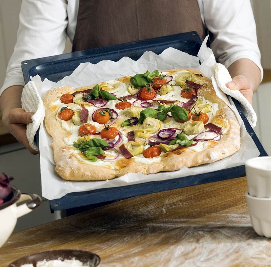 8. Kauli taikina leivinpaperin päälle uunipellin kokoiseksi ohueksi levyksi. Nosta taikinalevy papereineen pellille. Lisää haluamasi täyte ja paista 250 asteessa uunin keskitasolla 15-20 minuuttia, tai kunnes taikina on kypsää ja sen reunat ovat kullanruskeat.