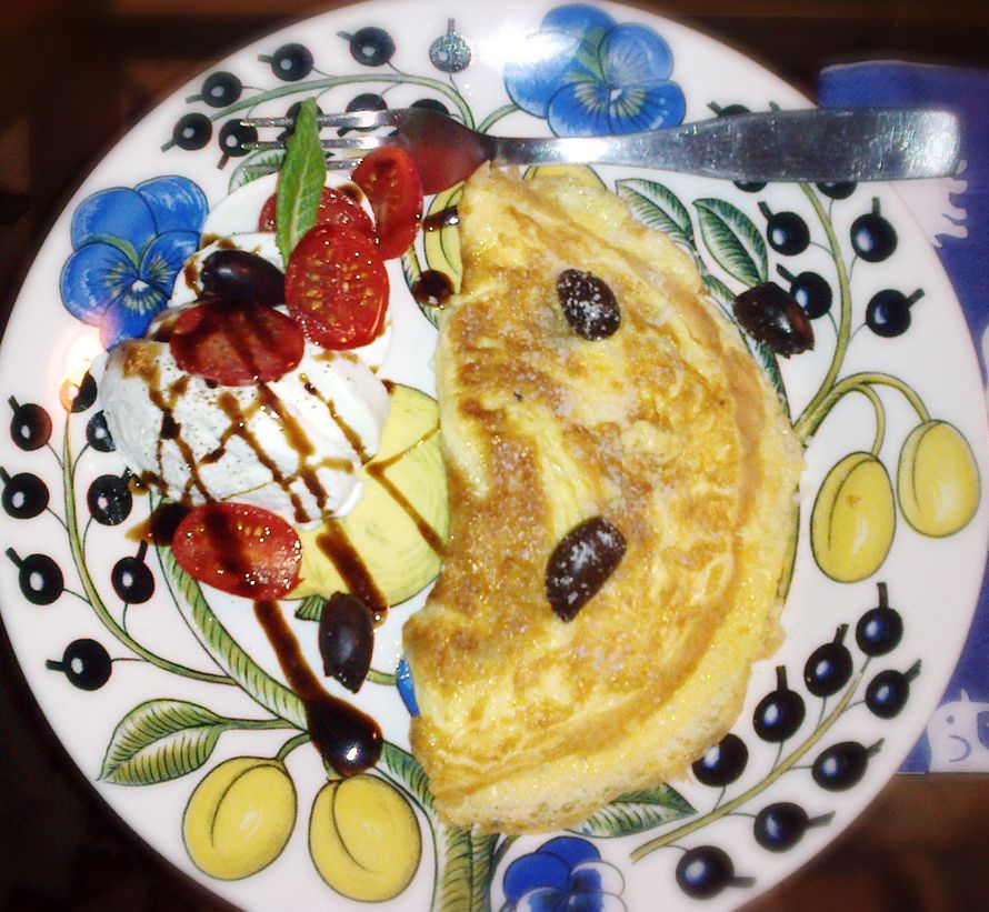 Munakas on yksi lempiruuistani, kun pitää tehdä jotain nopeaa ja yksinkertaista. Munia ja tomaatteja minulla on yleensä aina kaapissa. Nyt kävi tuuri, kun löytyi myös mozzarellapallo, joka oli jäänyt edelliseltä viikonlopulta.