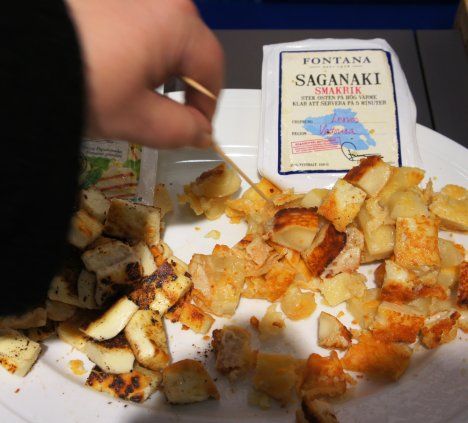 Demosta kävelin suoraan Fontana-tuotemerkin osastolle, sillä siellä näkyi heti tuttu naama. Fontana on perheyritys, ja perheen poika Loizos Papadopoulos kävi vuosi sitten meillä työpaikalla kertomassa perheensä yrityksestä suomalaisen maahantuojan, Kaj Erikssonin, kanssa. Suurin osa tuntee varmasti jo halloumijuustot, saganakia on saanut Stockmannilta. Messuilla esiteltiin meillä vielä tuntematon smakrik saganaki, jonka maku oli voimakas ja suussasulava. Juustoviipaleita paistettiin pannulla öljyssä.
