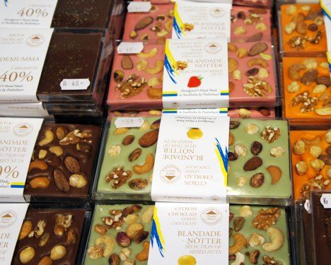 Suklaalevyistä otin kuvan, koska ne olivat niin kauniita. Ei makukaan ollut pöllömpi, mutta ei varsinaisesti suklainenkaan. Suklaissa Suomi-Ruotsi-maaottelun voitti ehdottomasti Fazerin Sininen. Pientuottajien tiskillä ihastuin vuohenmaidosta tehtyyn ranskankermaan. Ja Italiaa edustivat lukuisat erimerkkiset oliiviöljyt, suolakiteet, viinietikat yms.