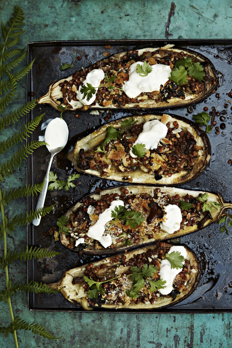 Kypsistä linsseistä ja uuden sadon sienistä saat herkullisen täytteen munakoisoille. Mainiot maut pyöristää lusikallinen turkkilaista jugurttia.
