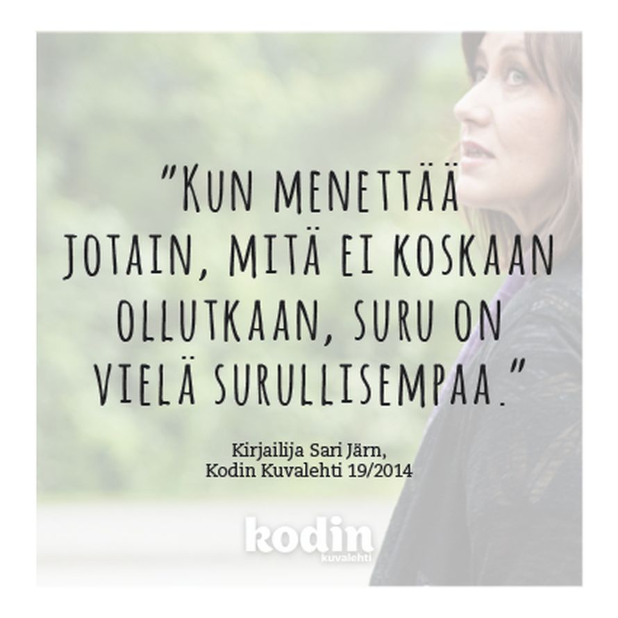 Sari Järn: Menettäminen on surullista 28.1.2015 klo 17:18 "Kun menettää jotain, mitä ei ole koskaan ollutkaan, suru on vielä surullisempaa." Kirjailija Sari Järn, KK19/2014 Oletko samaa mieltä? Kommentoi ja kerro. Tilaa Kodin Kuvalehti voimalause Tilaa Lue digilehtenä