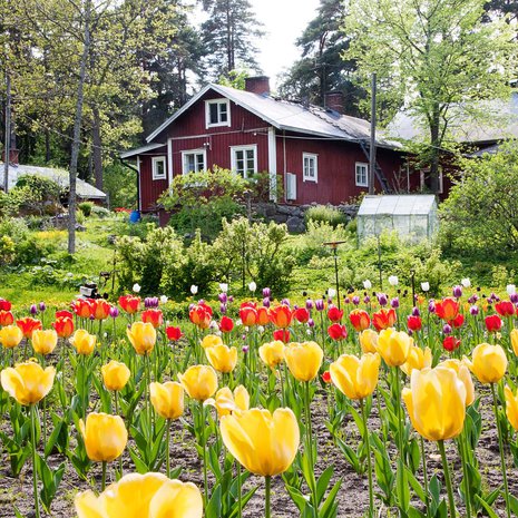 Ensimmäinen kotimme oli kerrostalokolmio, jossa haaveilin omasta kasvimaasta, puutarhasta ja talosta. Keväällä 1991 kiertelimme myynnissä olevia taloja. Suurin osa oli meille liian kalliita, mutta sitten löysimme pikkuilmoituksen ”remontoitavasta vanhasta puutalosta”. Riensimme paikalle ja ihastuimme oitis suureen tonttiin, jolla kukkivat sadat narsissit, helmililjat ja lemmikit.