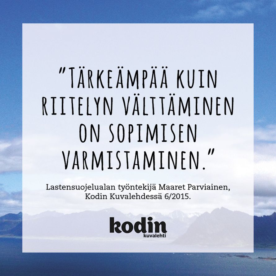 Sopimisen tärkeydestä 9.6.2015 klo 10:35 ”Tärkeämpää kuin riitelyn välttäminen on sopimisen varmistaminen.” Lastensuojelualan työntekijä Maaret Parviainen, KK 6/15. Tilaa Kodin Kuvalehti voimalause Tilaa Lue digilehtenä