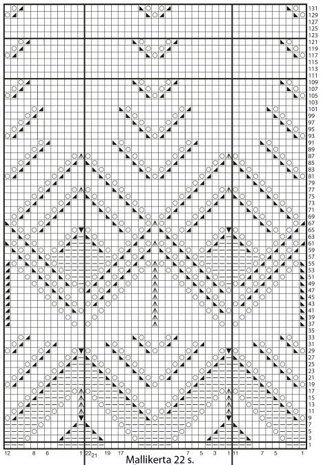 Takakappale: Luo 113(127)145(157)171 s, neulo sitten ruutupiirroksen mukaista joustinta (piirroksen alin ruuturivi) aloittaen 1 reuna-s:n (= rs) sisällä piirroksen oikean reunan silmukasta 1(5)7(1)5 ja neulo silmukkaan 11 saakka. Toista sitten 22 s:n mallikertaa 4(5)6(6)7x ja neulo vielä alkua vastaavat s:t mallikerran lopusta vasemmalle ja viimeiseksi 1 rs. Toista kerroksia 1 – 2 yhteensä 40 krs, jatka 1 rs:n sisällä pitsineuletta ja aloita samasta kohdasta kuin joustin.