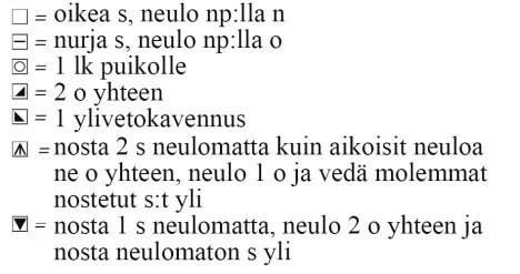 Pitsineule: Ruutupiirroksen mukaan. Piirrettynä on vain op:n krs:t, neulo nurjalla s:t siten, miltä ne näyttävät ja lk:t n.