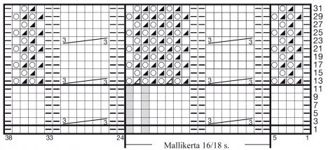 Takakappale: Luo paksummille puikoille 92(102)108(124)140 s, neulo np:lla 1 krs n. Neulo sitten ruutupiirroksen mukaista palmikkojoustinta aloittaen 1 reuna-s:n = rs) sisällä silmukasta 6(1)6(6)6, toista sitten mallikertaa (joustimessa 16 s) 5(5)6(7)8x ja neulo vielä s:t 24 - 33(38)33(33)33. Kun olet neulonut krs:t 1-12, neulo vielä krs:t 3 – 12 kerran.