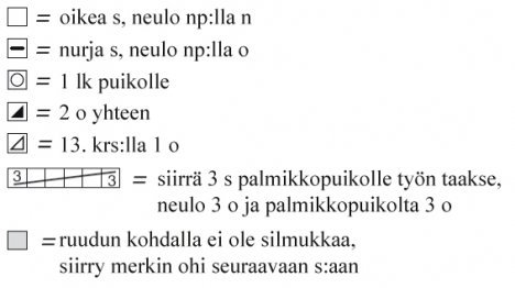 Pitsipalmikkoneule: Ruutupiirroksen mukaan. Piirrettynä on vain op:n krs:t, neulo nurjalla s:t siten, miltä ne näyttävät ja lk:t n.