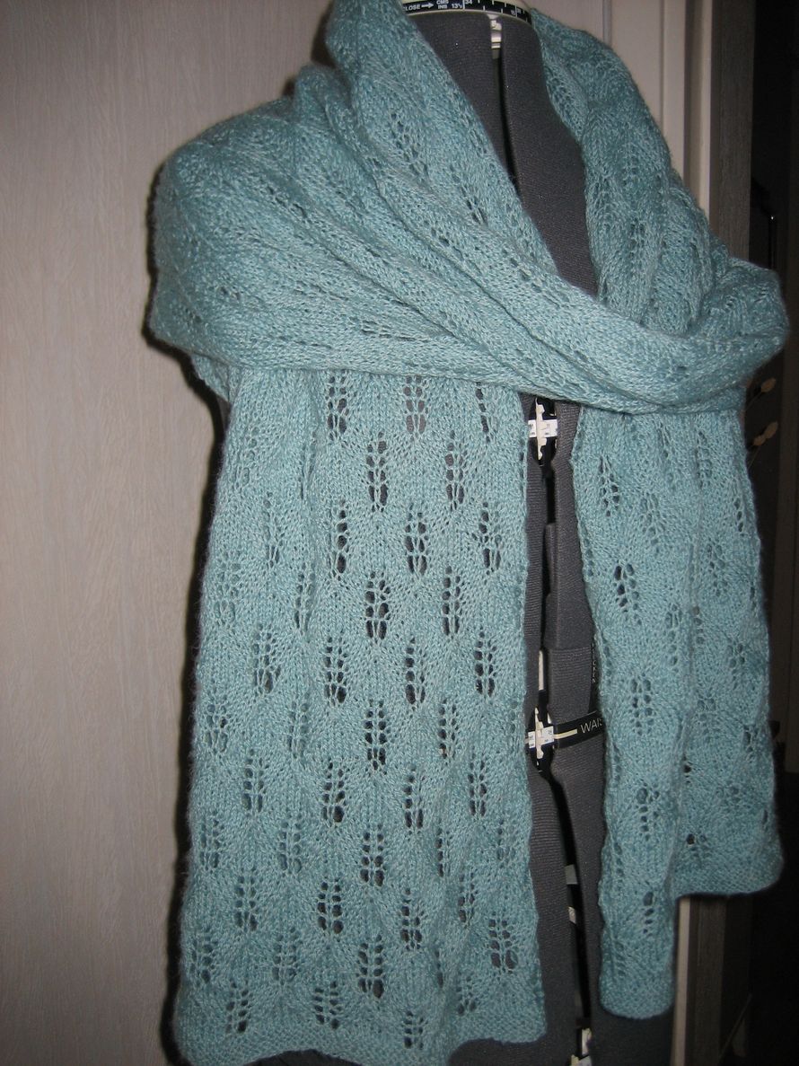 Tähkähuivi on tehty Suuressa Käsityölehdessä 5/2009 ollutta mallia mukaillen. Lankana käytin vedenvihreää Pirkanmaan Pirkka-lankaa, jota sattui olemaan kaappien kätköissä 300 gr. Lanka olikin oikein sopivaa tähän tarkoitukseen; se on ohutta, jolloin myös kuvio tulee kivasti esille. Tein huivista huomattavasti ohjetta leveämmän version, jotta sen voi räntäsateen sattuessa kiepsauttaa pään suojaksi.