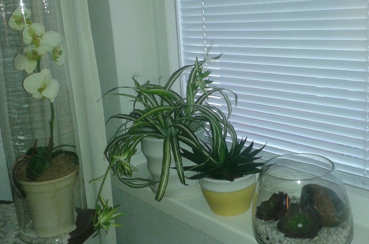 Kuva huonekasveistani. Siinä on orkidea, juoru, aaloe ja pari mehikasvia astian pohjalla olevalla hiekka-aavikolla.
