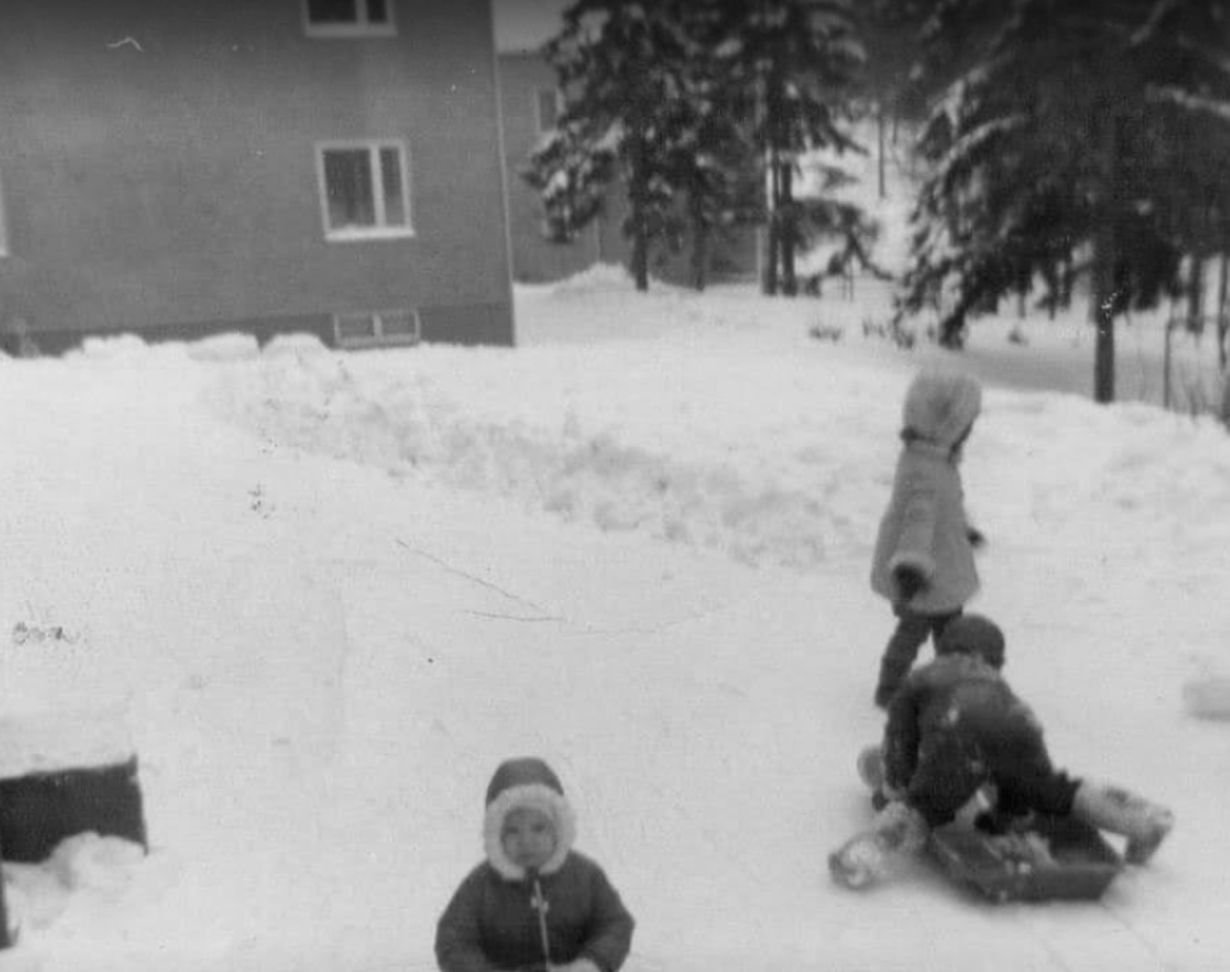 Tässä kuvassa minun pikkusisko istuu maassa, ja minä vedän pulkalla naapurin Markusta Helsingissä. Tämä kuva muistuttaa minua ihanasta elämäntäyteisestä lapsuusajasta ja siitä että ei saa unohtaa aikuisenakaan sitä pientä ihmistä joka olit, anna hänelle tilaa, ole hauska, hupsukin välillä.