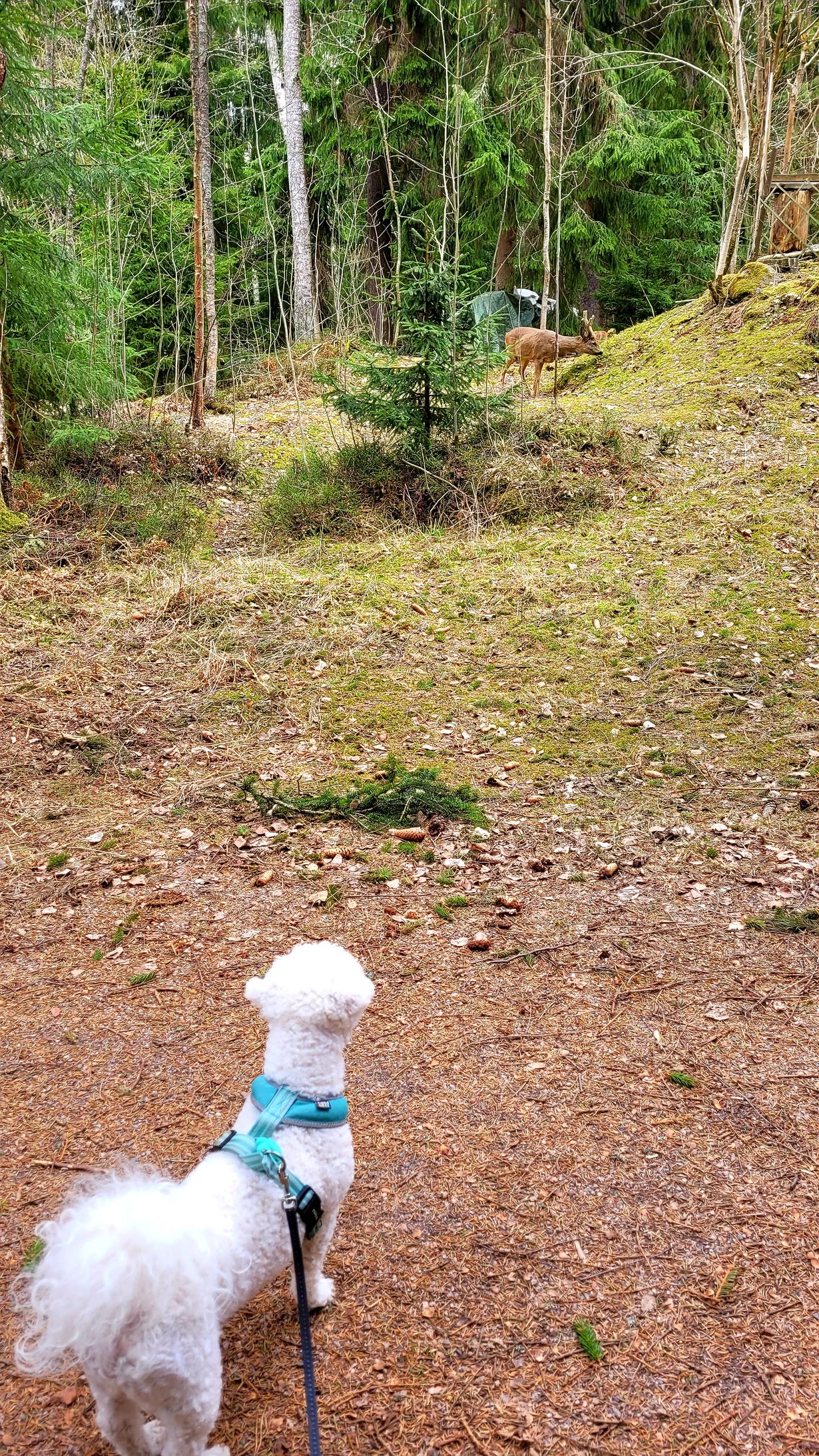 Elmo-koira tapasi peuran eikä kumpikaan pelästynyt kohtaamista.