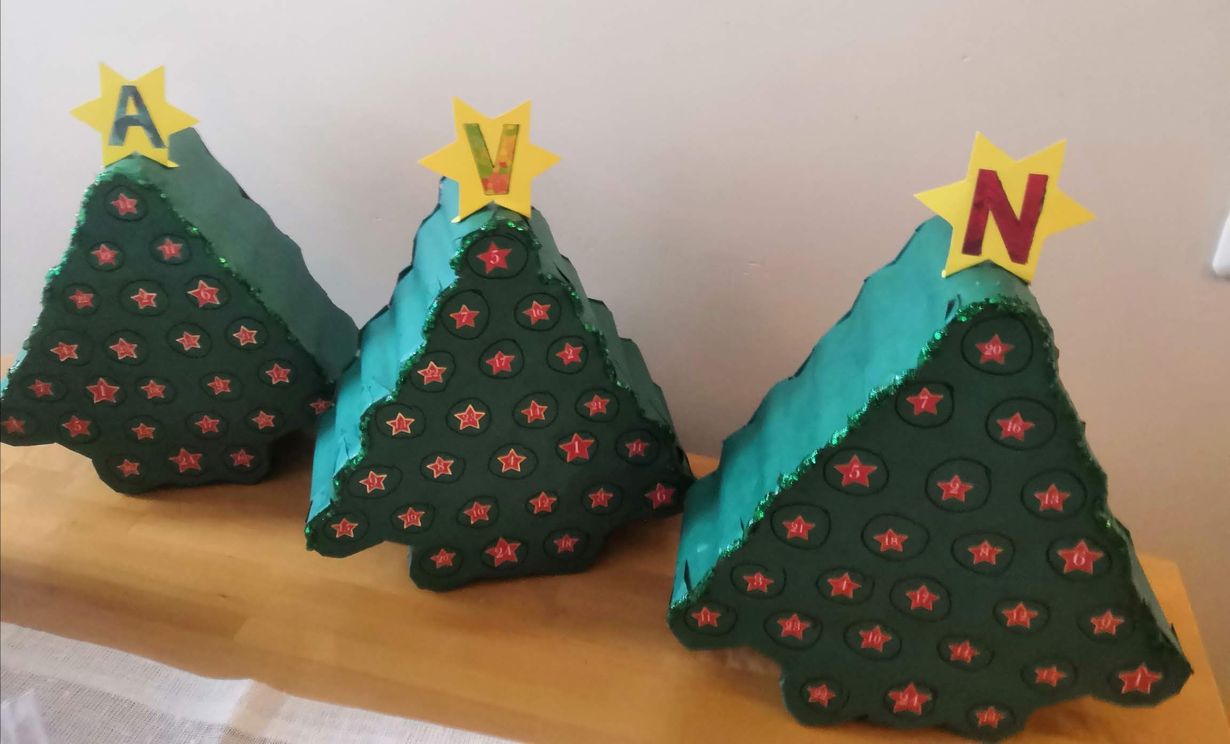 Kuusen tähdessä kalenterin omistajan nimikirjain josta oman erottaa. Tehty wc-papperirullista ja silkki paperista. Takana kartonki tukemassa. Kovasti tykätty kalenteri sisälsi herkkuja ja erilaisia tekemistä mm.piparkakkujen leipomista, retki, leffa yms.