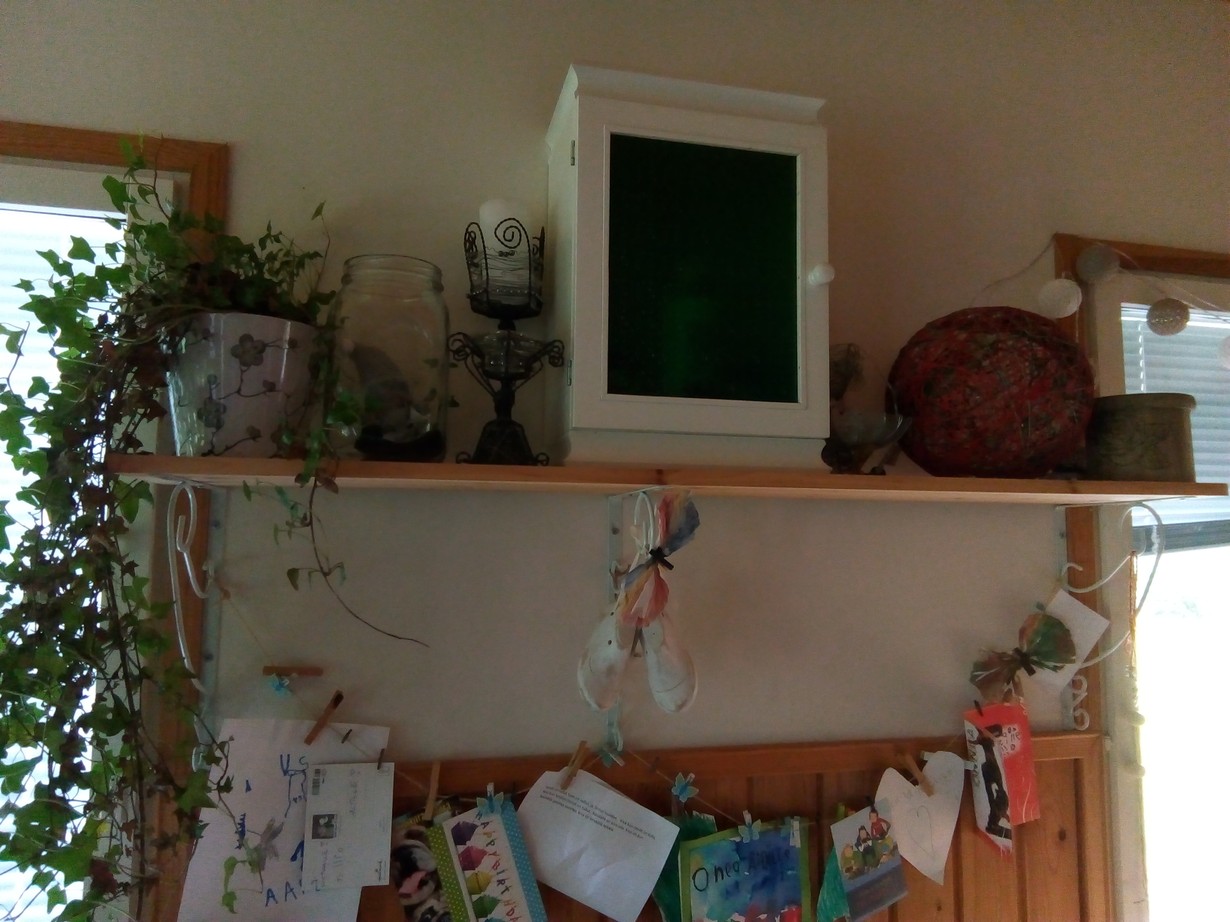 Tämän kevyen hyllykön suunnittelin itselleni lahjaksi kun täytin 40 vuotta. Hylly kantaa omatekemiäni ja lahjaksi saamiani rakkaita tavaroita ja esittelee "pyykkinarulla" tuoreimmat kortit ja askartelut.