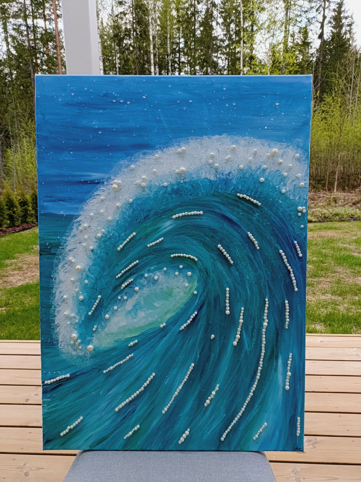 Tyttäreni maalaama taulu ja helmiä 40v hääpäiväksi. Elämän Aalto. (Vesiväri- akvarelli)Kodissamme on muitakin hän maalaamiaan taideteoksia.