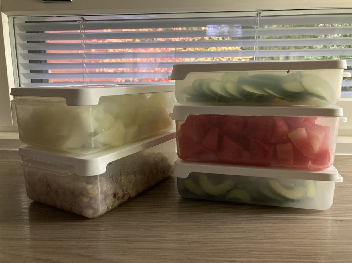 Valmiiksi pilkottuja hedelmiä ja kasviksia jääkaapissa. Helppo ottaa aamupalalle, tehdä lounassalaatti tai napata suuhun muuten vain kun kun tulee himo napostella jotakin.