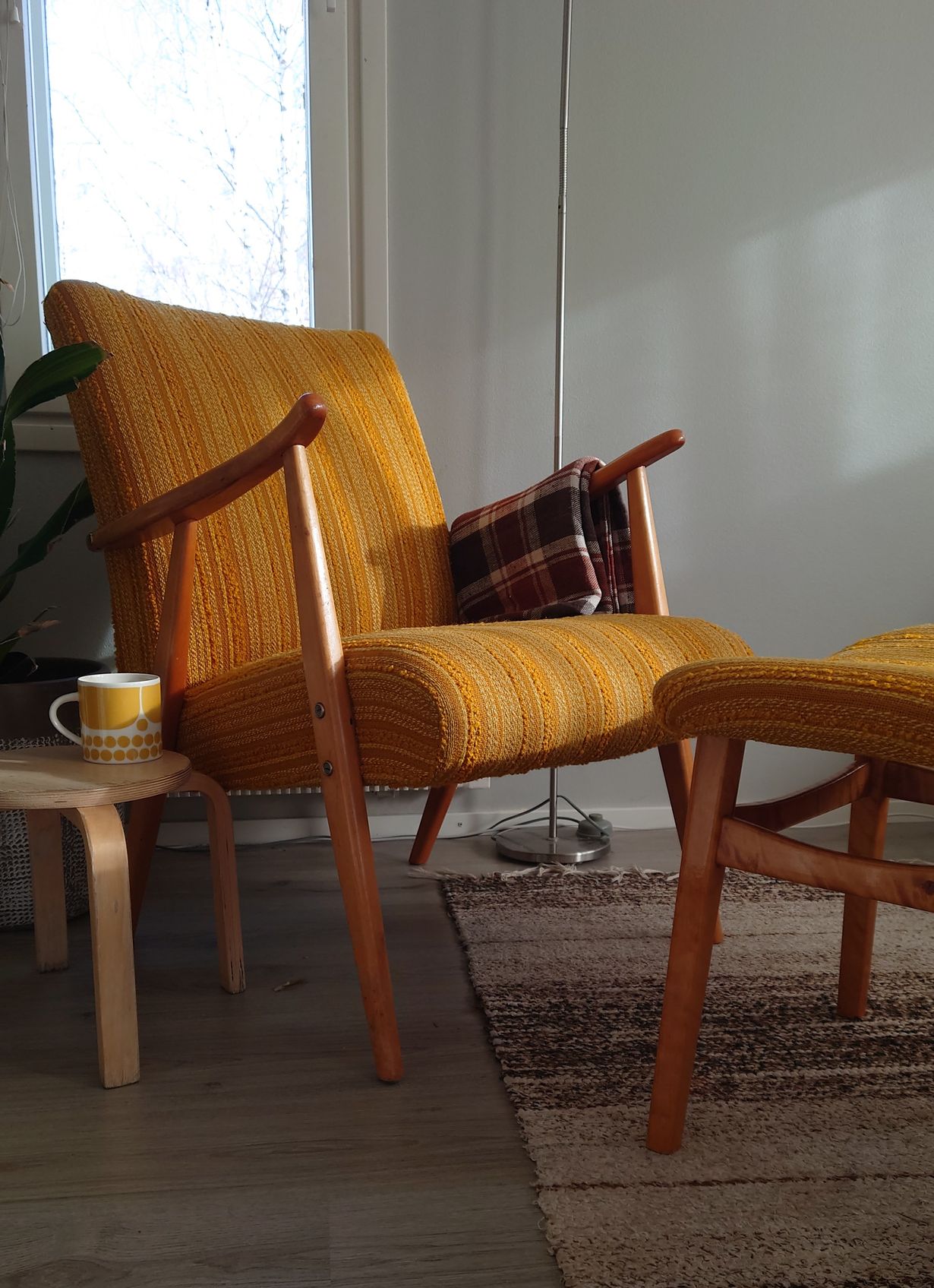 Torista löytyi 2 tämmöistä kauneutta. Tuolit olivat aikoinaan olleet eräällä lääkärillä, joka oli pitänyt tuolit muoveissa, minkä takia tuolien kankaat ovat hienossa kunnossa. Sieltä päätyivät pariskunnalle, jolta me vuorostaan ostimme tuolit. Vanhempi pariskunta oli omistanut tuolit 20 vuotta, mutta ikääntyessään tuolien istuinkorkeus oli käynyt hankalaksi, joten luopuovat tuoleista haikein mielin. Tulivat kuitenkin hyvään kotiin, jossa toivottavasti kestävät vielä pitkään.