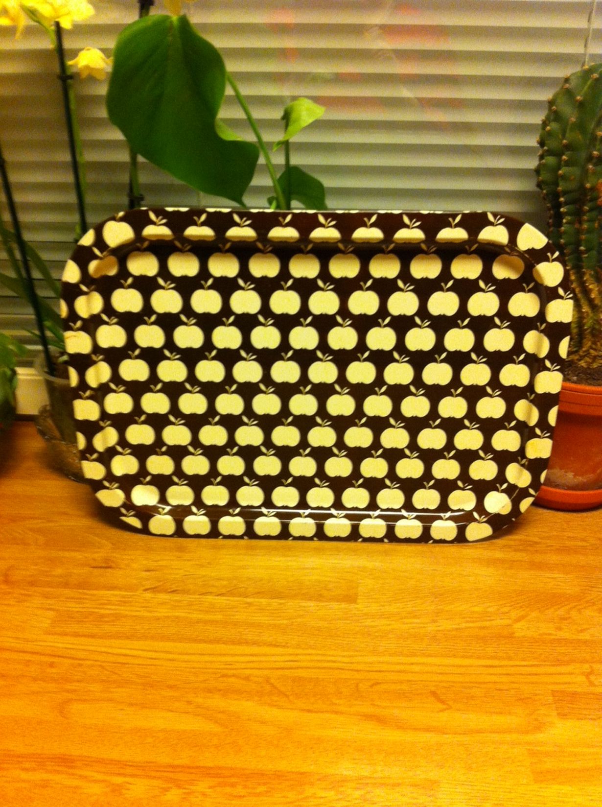 Tämä ihana omenainen tarjotin on kulkenut perheeni matkassa monen kodin kautta aina lapsuudestani 70-luvulta tähän päivään... Se on mukana sekä lapsuuteni valokuvissa että tämän päivän kattauksissa, ja sulautuu molempiin kuin varta vasten hankittuna. Voisin kuvitella että vastaavaa designia löytyy tämän päivänkin sisustusosastoilta...