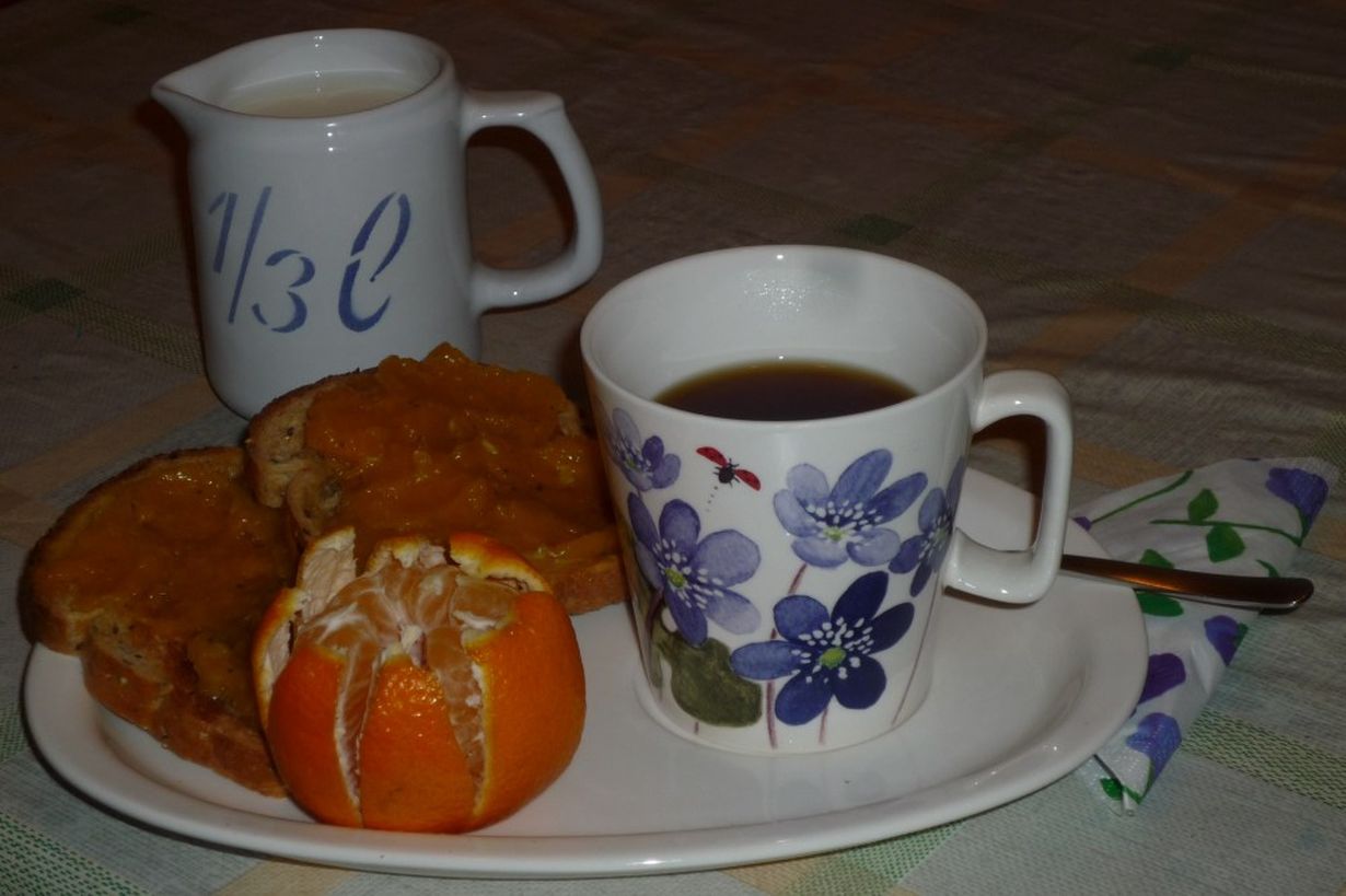 Aamiaisastiasetin olen saanut äitienpäivälahjaks. Aloitan aamun täysjyväpaahtoleivällä, isolla kupillisella maitokahvia sanomalehteä lukien. Leivän päälle runsaasti omatekoista marmeladia. Yleensä syön myös hedelmän tai tuoretta marjaa. Kuvan paahtoleipien päällä on pallokurpitsamarmeladia.
