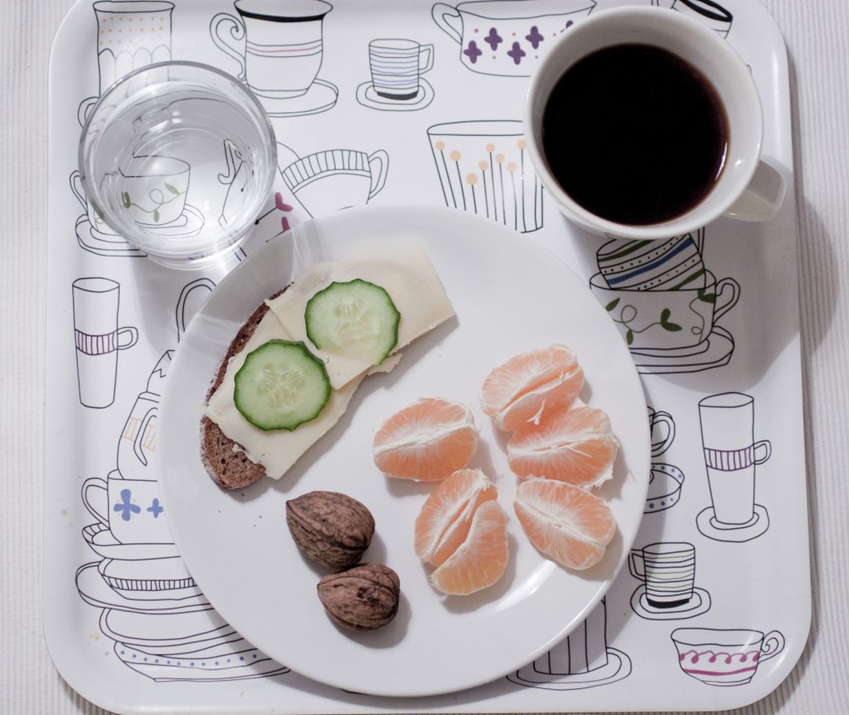 Raikasta vettä, viipale tummaa leipää keran goudan ja kurkkuviipaleiden. Mehevä mandariini ja kaksi saksanpähkinää, jotta aivotoiminta pysyisi hyvällä vireystasolla koko päivän.