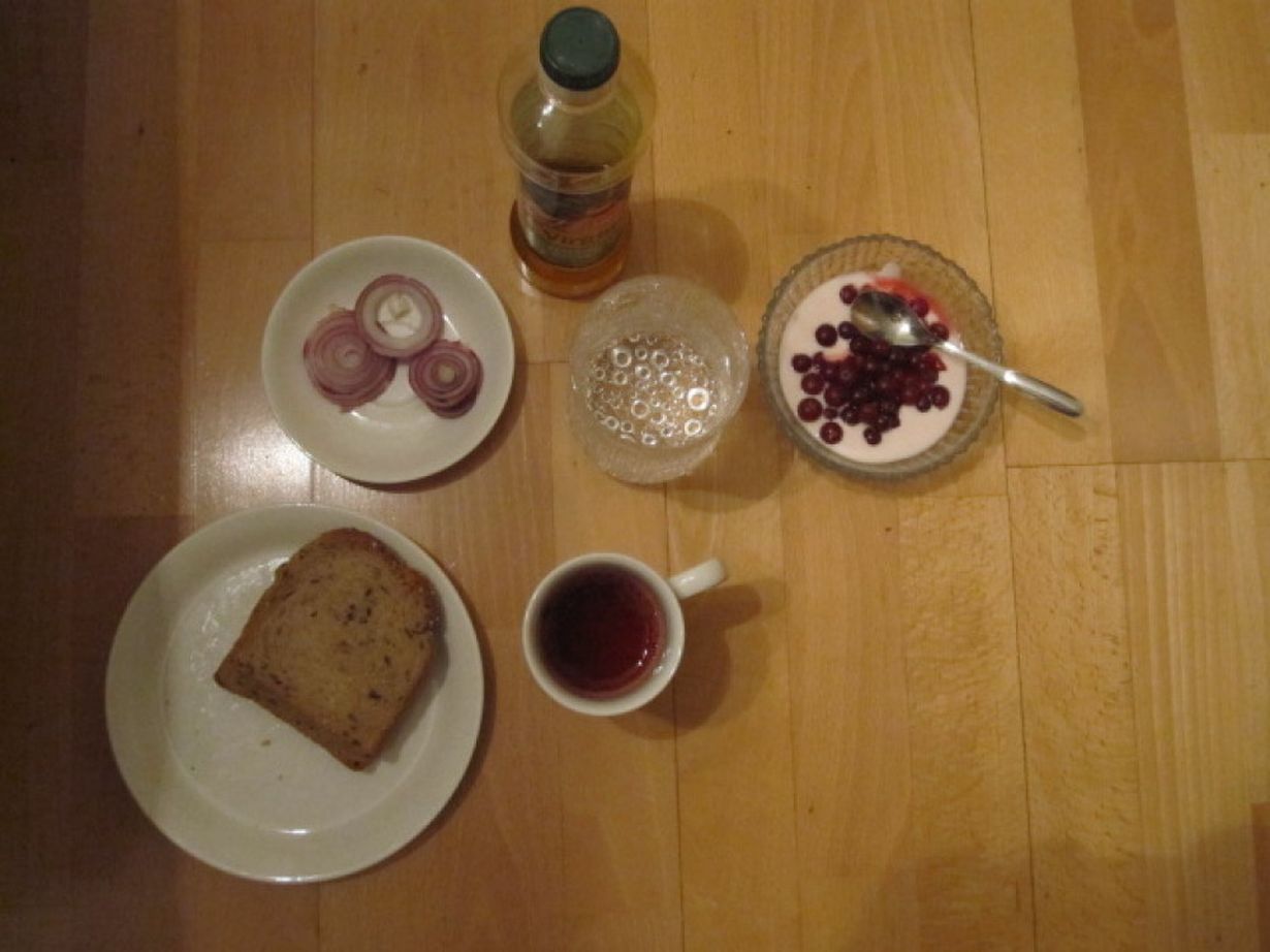 Virgiloilia, leipää, mehua, jogurttia ja kahvia
