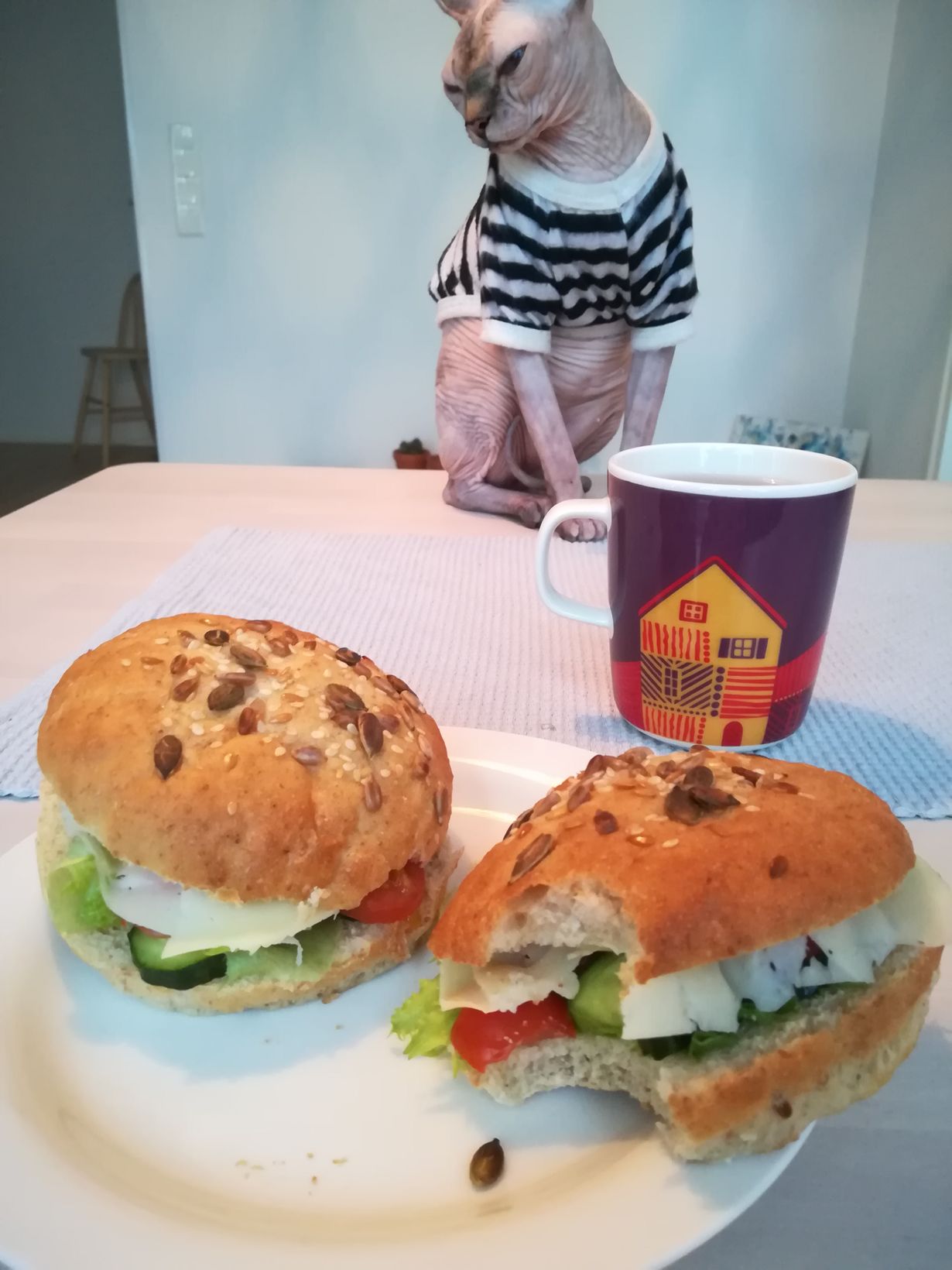Itsetehdyt sämpylät ja teetä aamupalaksi. Ja kissa aamupala seurana.?