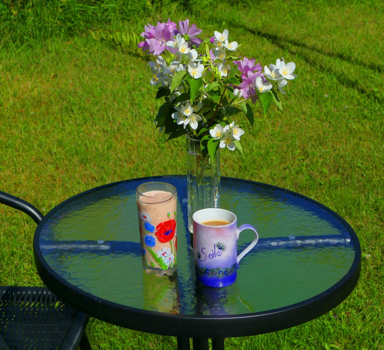 Aamupalani on lasillinen marja- tai hedelmäsmoothieta ja kaksi mukillista kahvia. Ihan parasta kesäaamuisin puutarhassa.