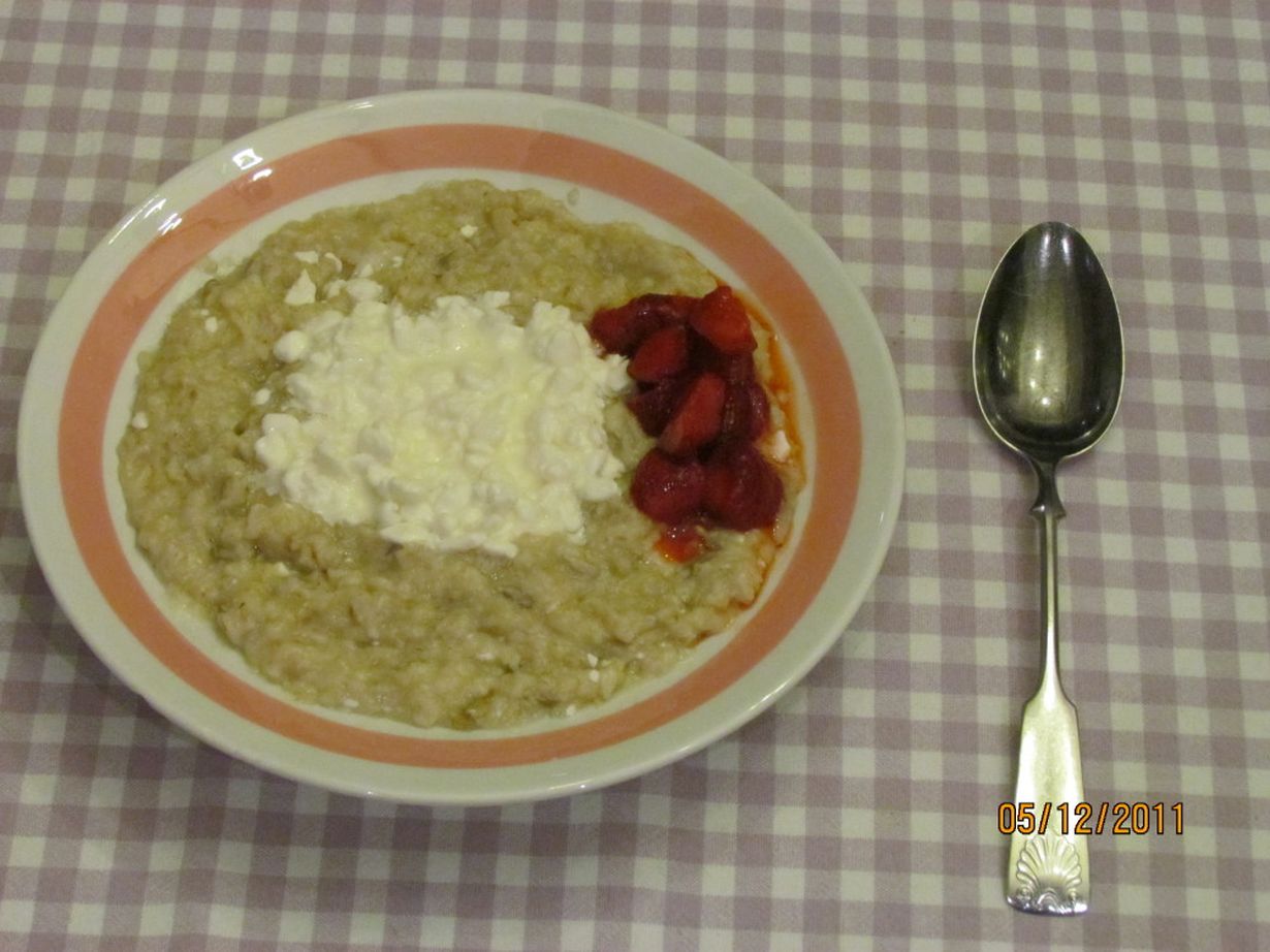 Päiväni käynnistyy kaurapuurolla, johon sekoitan auringonkukansiemeniä, raejuustoa ja itse kasvatettuja mansikoita. Kyytipoikana on rasvaton luomumaito.NAM!
