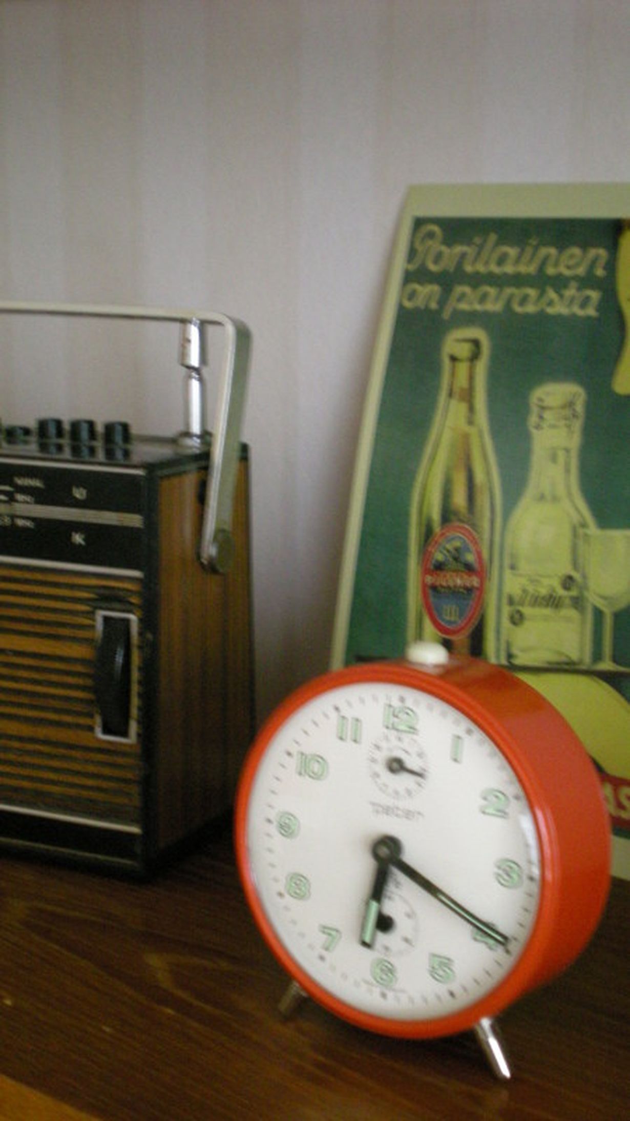 Löysin tämän aarteeni kirpputorilta naurettavaan 2 euron hintaan. Poistuin kirpputorilta tyytyväisenä uusi kello mukanani jonka herätysääneen ei voi olla heräämättä.
