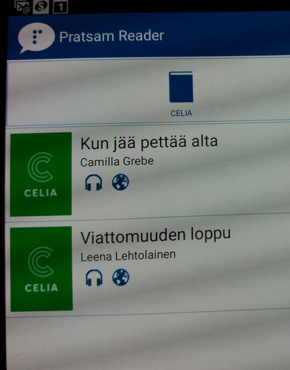 Minulla on aina kirja kuunneltavana - työmatkat sujuvat mukavasti. Kirjan voi ladata kännykkään tai tabletille ja kuunnella kun itse sopii ja mikä parasta - Celia kirjaston palvelu on ilmaista! Suosittelen!!!