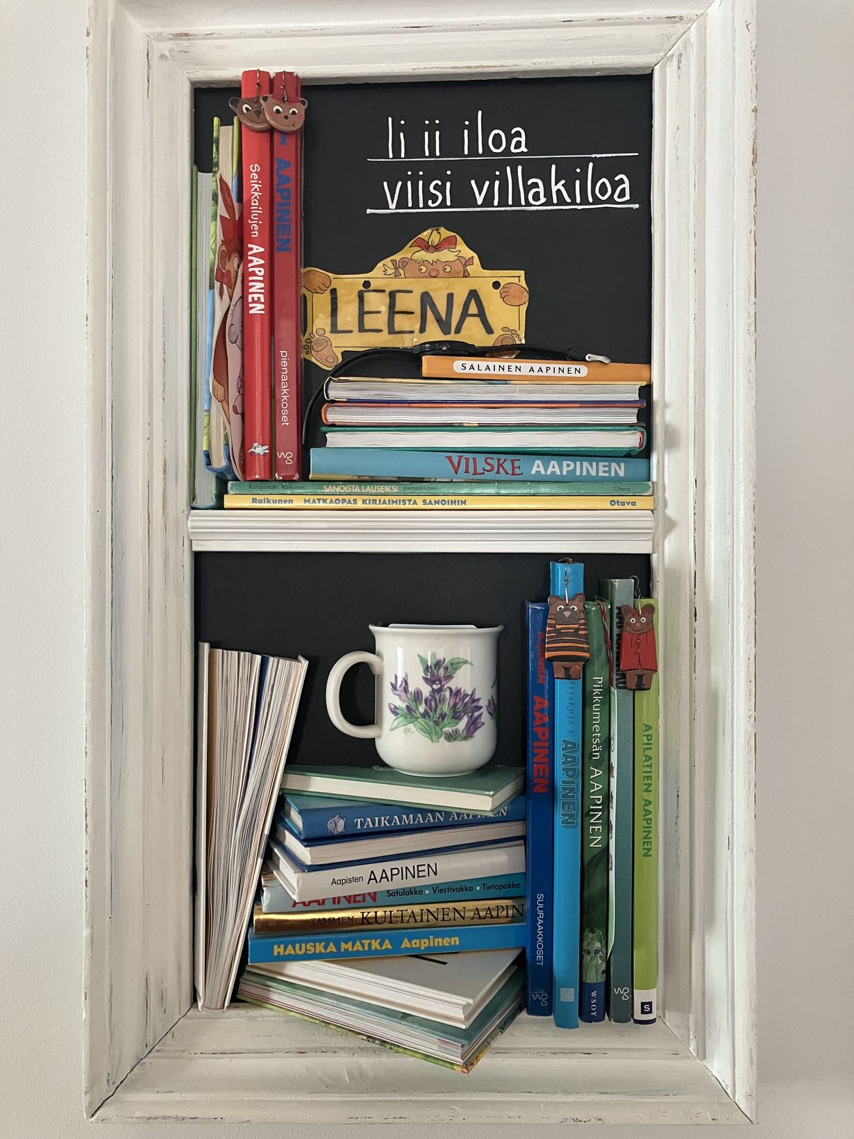 Jäädessäni eläkkeelle halusin itselleni konkreettisen muiston työurastani. Netissä tuli vastaan kuva kirjataulusta. Vein kassillisen Aapisia, työkirjoja ym muistoja Katrille (Katrin kirjataide) ja hän toteutti tämän kirjataulun.