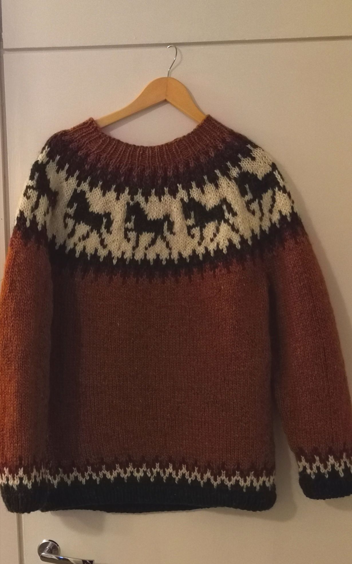 Harrastan ratsastusta islanhevosilla. Ja siihen liittyy myös aidot islannin villapaidat. En osaa itse kutoa ja haaveilin villapaidasta. Haave toteutui, kun eräs ystävällinen ihminen sen minulle kutoi! Värit vaihtuivat hiukan, kun haluamani lankoja ei saanut. Samat värit, mutta tummenpana. Lempparivärit!