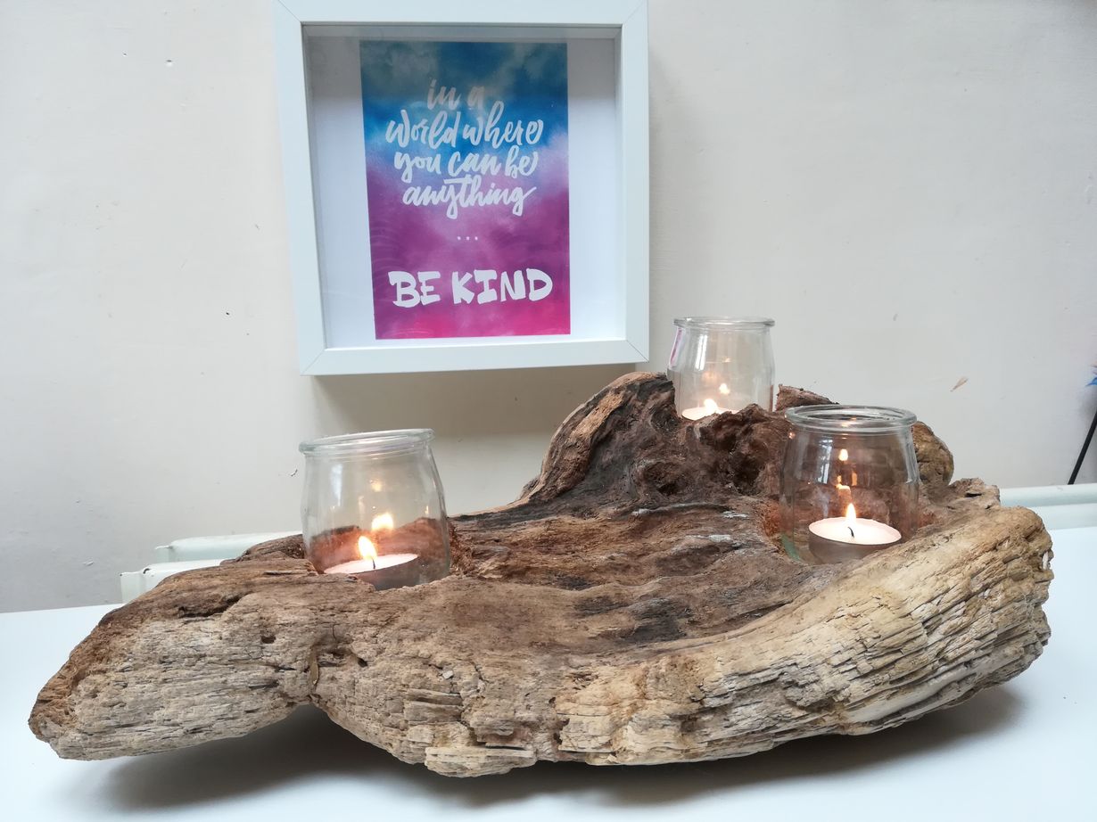 Tykkään näpertää kaikenlaista ja varsinkin luonnon materiaaleista. Tämä uppopuu löytyi retkellä lähirannalle ja tuikkukupit ovat ranskalaisia, lasisia jugurttipurkkeja. Tiesin hiihtolomalla että niille löytyy käyttöä ja toin ne kotiin matkalaukussa. Porasin uppopuuhun jugurttikuppien kokoiset kolot ja tässä on tulos!
