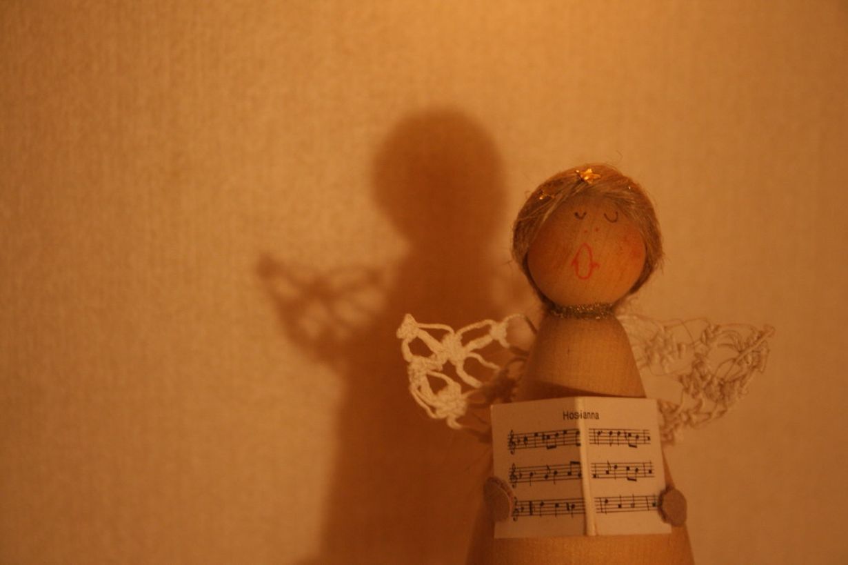 Esikoistyttäremme syntyi 1. adventtisunnuntaina. Tämä enkeli otetaan esiin joululaatikosta joka vuosi "Hoosianna-päivänä".(34 vuotta vanha puuenkeli, pitsisiivet, pellavainen poninhäntä, pienen pieniä kultatähtiä hiuksissa, korkeus 8 cm)