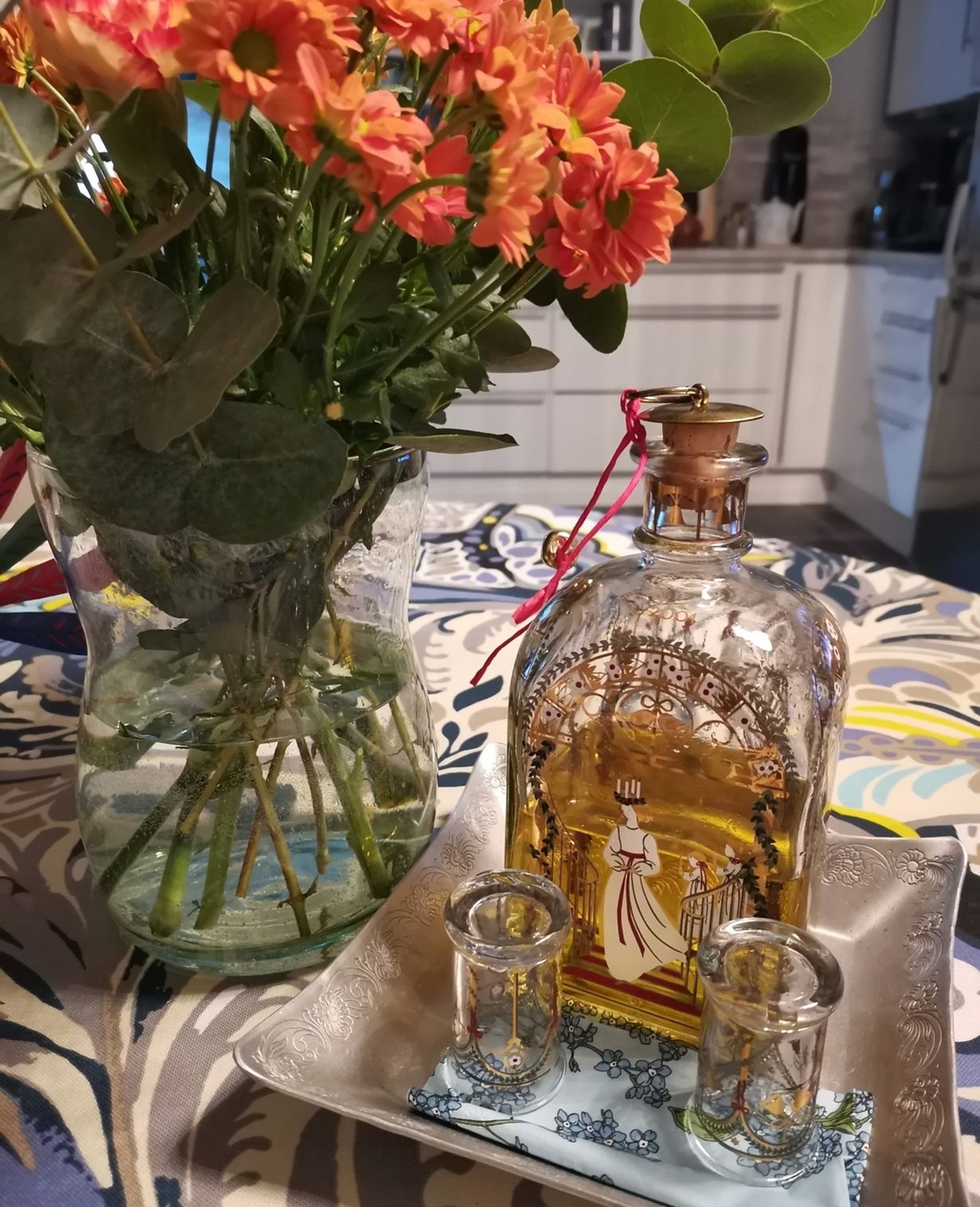 Puolisoni sai lahjaksi kauniin snapsisetin, jolla ei ollut meillä käyttöä. Koska emme saaneet sitä myytyä, päätimme ottaa käyttöön kahden aikuisen adventtikalenterin. Likööriä nautitaan pieni lasillinen adventtisunnuntaina. Valitsemme vuorotellen kalenterin liköörin. Perinteestä on tullut meille rakas.