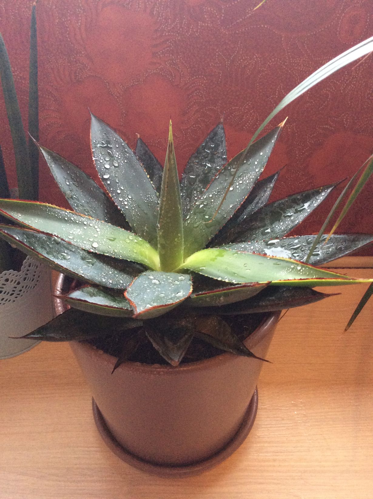 Tämä oli niin jännittävän näköinen huonekasvi, että tykästyin siihen viime syksynä heti. Meksikosta peräisin oleva kasvi saa kuivahtaa välillä, on helppohoitoinen. Mutta lehdet ovat hyvin terävät, joten vaatii varovaista käsittelyä.
