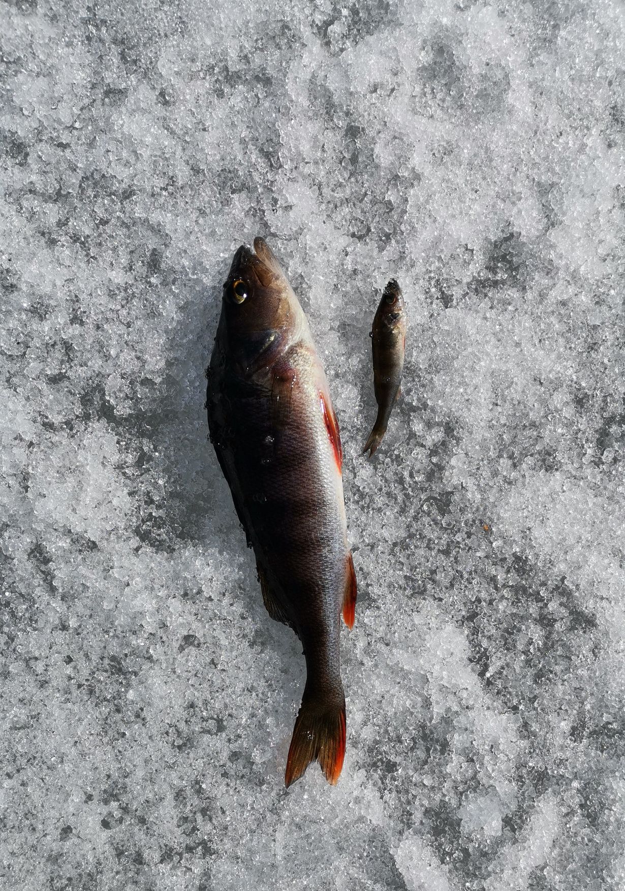 Pääsiäisenä sain vain ne kuuluisat kaksi kalaa, tosin yhdellä pilkin nykäisyllä. Miekojärvellä isäni synnyinseudulla pilkillä sain tämän erikoisen ahvenen. Hetken jäällä pyristeltyään ahvenen sisuksista pullahti toinen ahven. Saalistapa ei sitten tullut muuta.