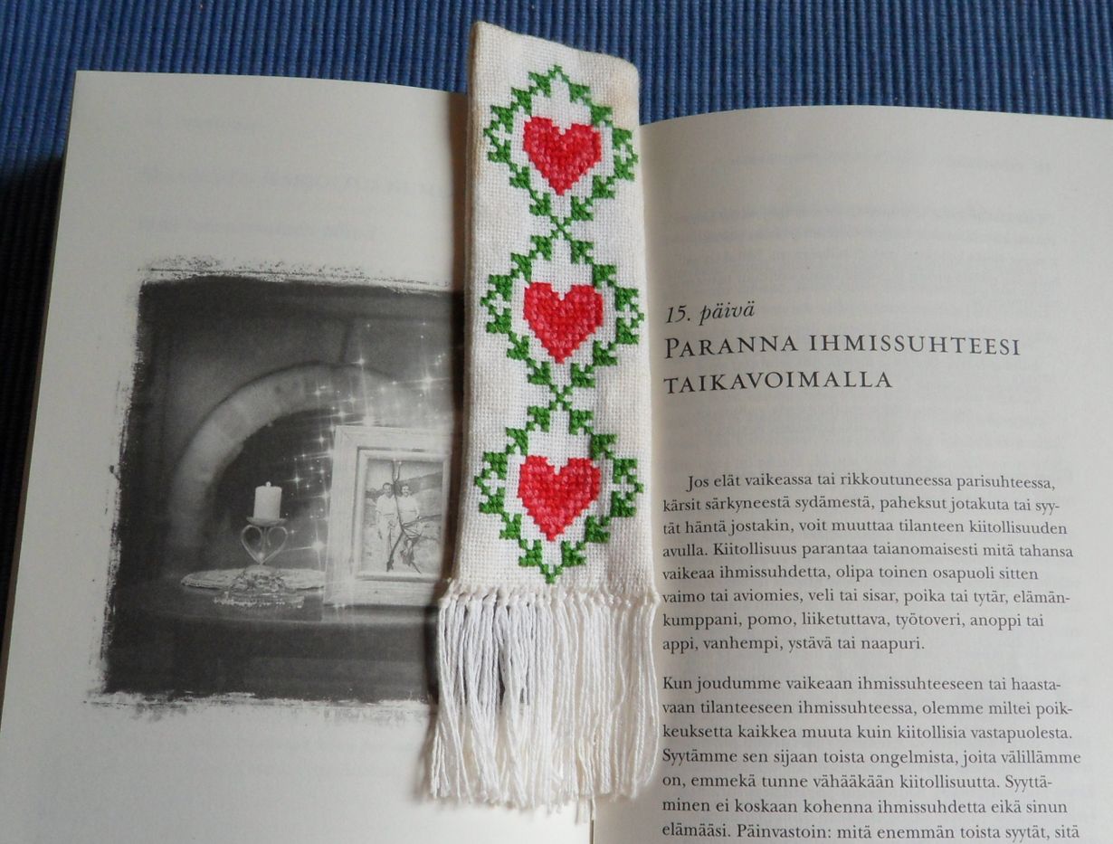 Tämän kirjanmerkin tein äidilleni kauan sitten. Äitini ei ole enää merkkiä käyttämässä, joten se palautui tekijälle.