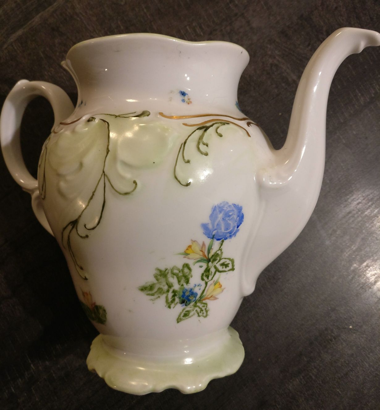 Äitini aloitti posliinimaalauksen 10 vuotta sitten 85-vuotiaana, korona katkaisi viime keväänä tämän harrastuksen. Sain pannun häneltä muutama vuosi sitten.