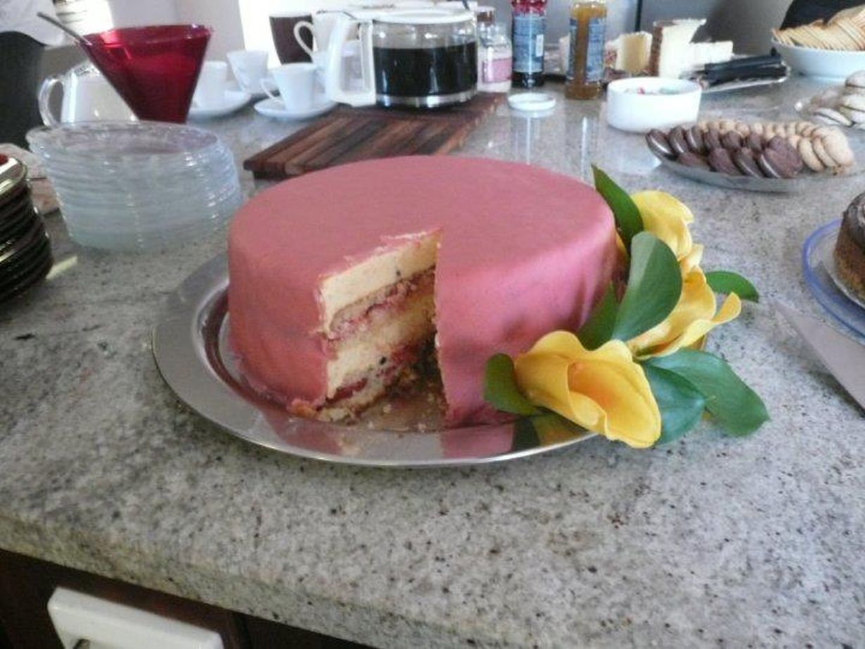 Äidin päivä se on synttärikin! Mangomoussea ja tuoreita mansikoita.... marsipaania - ihan herkkua! Tällä kakulla on pärjätty KK kisassakin!