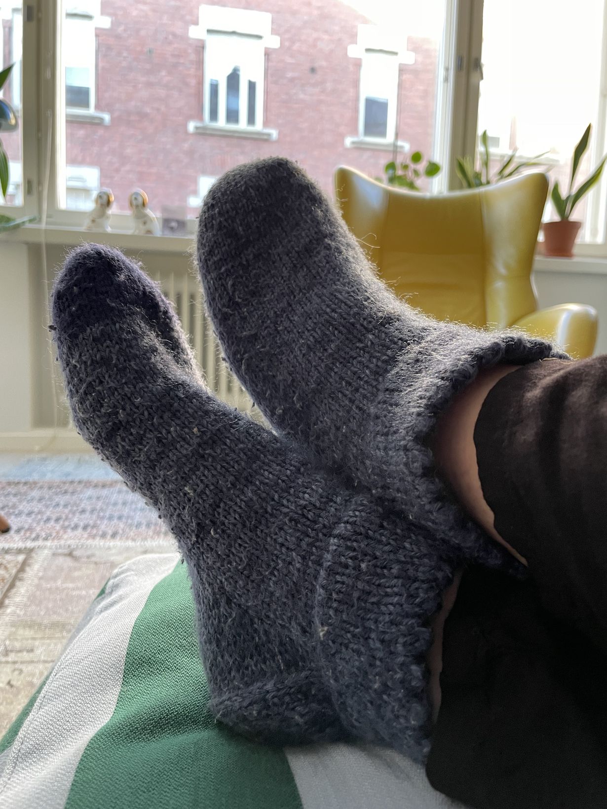 Rakastan villasukkia ja äitini oli käsityöihminen. Käydessäni vierailulla sain häneltä usein villasukat. Menetin äitini yllättäen kesällä. Nämä villasukat oli hänen. Nyt ne on minun ja entistä arvokkaammat. Villasukkia tarvitaan myös Helsingin kesässä.