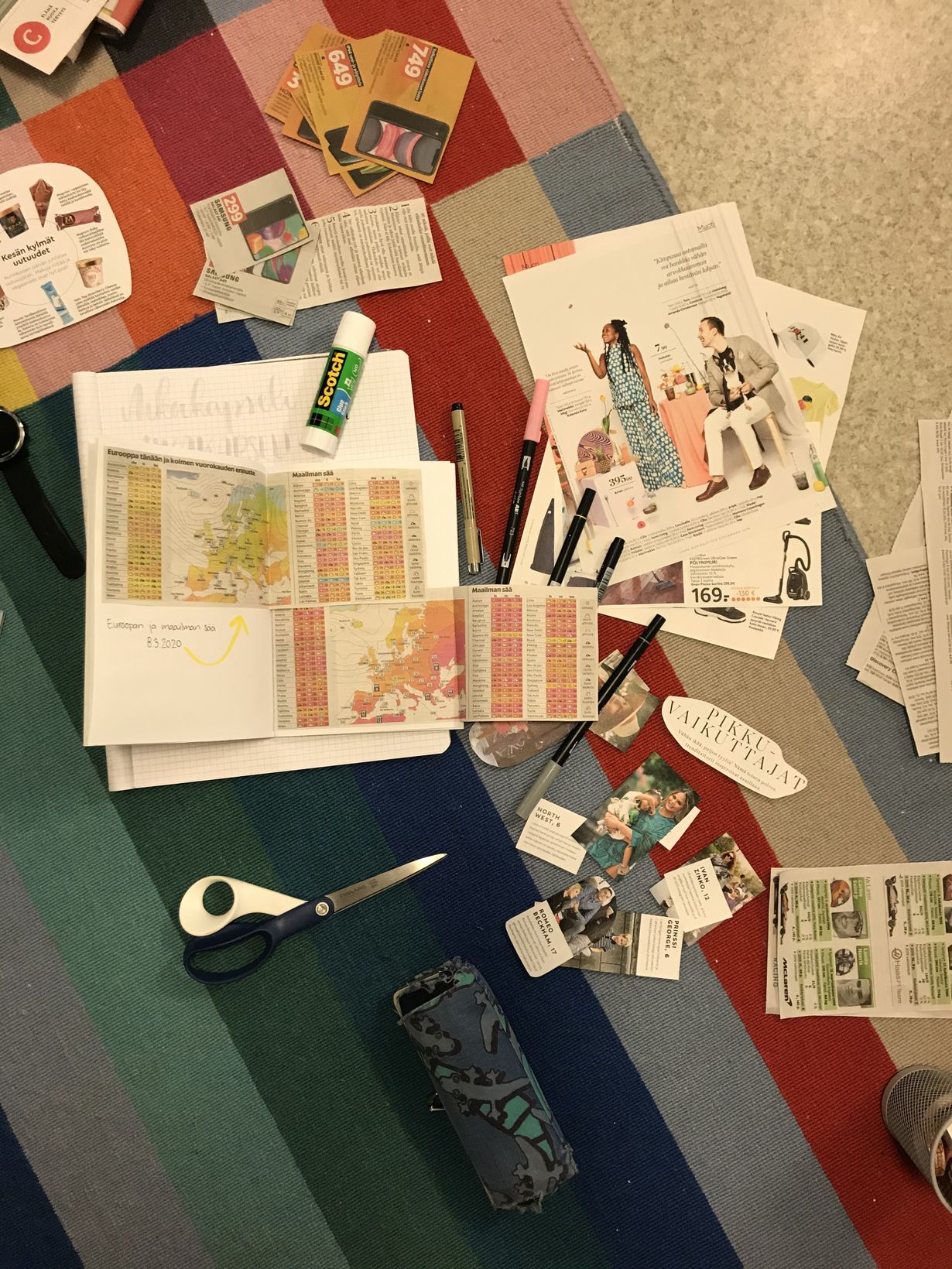 Tulevalle ystävän vauvalle askartelin vihkoon aikakapselin, johon keräsin tästä vuodesta ja ajasta kertovia lehtileikkeitä ja tilastoja. Sitten kun vauva kasvaa isommaksi, voi hän palata aikamatkalle siihen vuoteen jona syntyi tämän aikakapselin avulla ja nähdä miten maailma on muuttunut. Aikakapseli annettiin lahjaksi hänen äidilleen järjestetyillä vauvakutsuilla. Kuvassa olen parhaillani tekemässä sivua, johon olin leikannut Euroopan ja maailman säästä kertovia sääkarttoja.