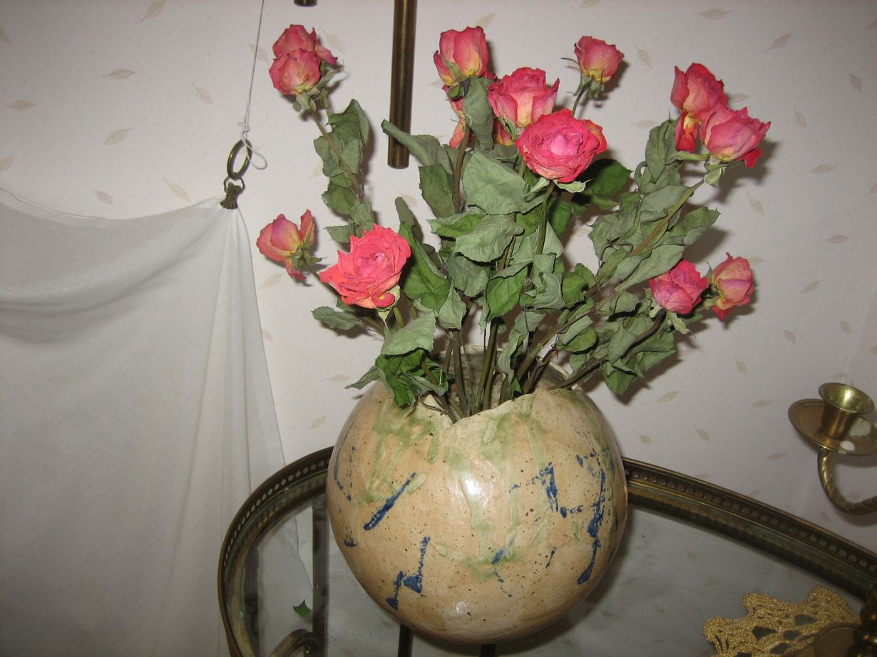 Maljakkona käsintehty, poltettu ja lasitettu lahjapotti, jossa kukoistavat ruusut rauhassa kuivuen aina kunnes seuraavia taloon saadaan.