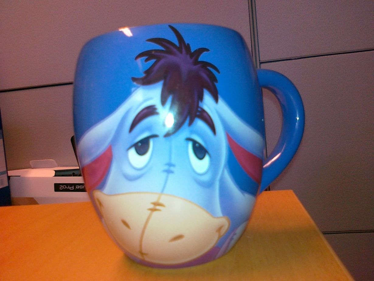Sain kahvikupin kummitytöltäni joku vuosi sitten syntymäpäivälahjaksi. Siihen mahtuu ainakin 4 dl juomaa, joten pidän sitä töissä. Ei ainakaan heti lopu juotava kesken. Ja Ihaa on niin ihana:)