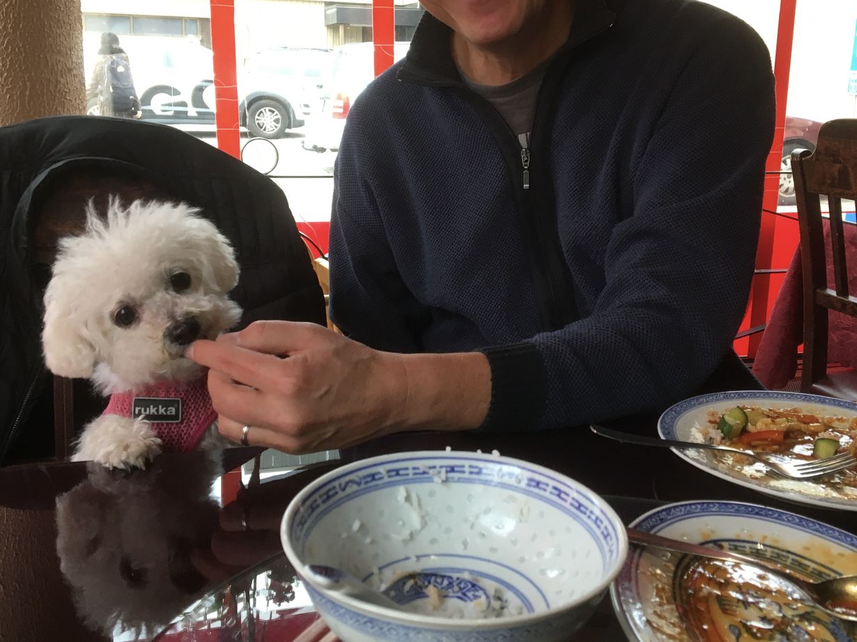 Koiramme Inkeri on aina mukana. Tässä olemme kiinalaisessa ravintolassa. Inkerillä tahtoo aina istua omalla tuolilla ravintolassa.